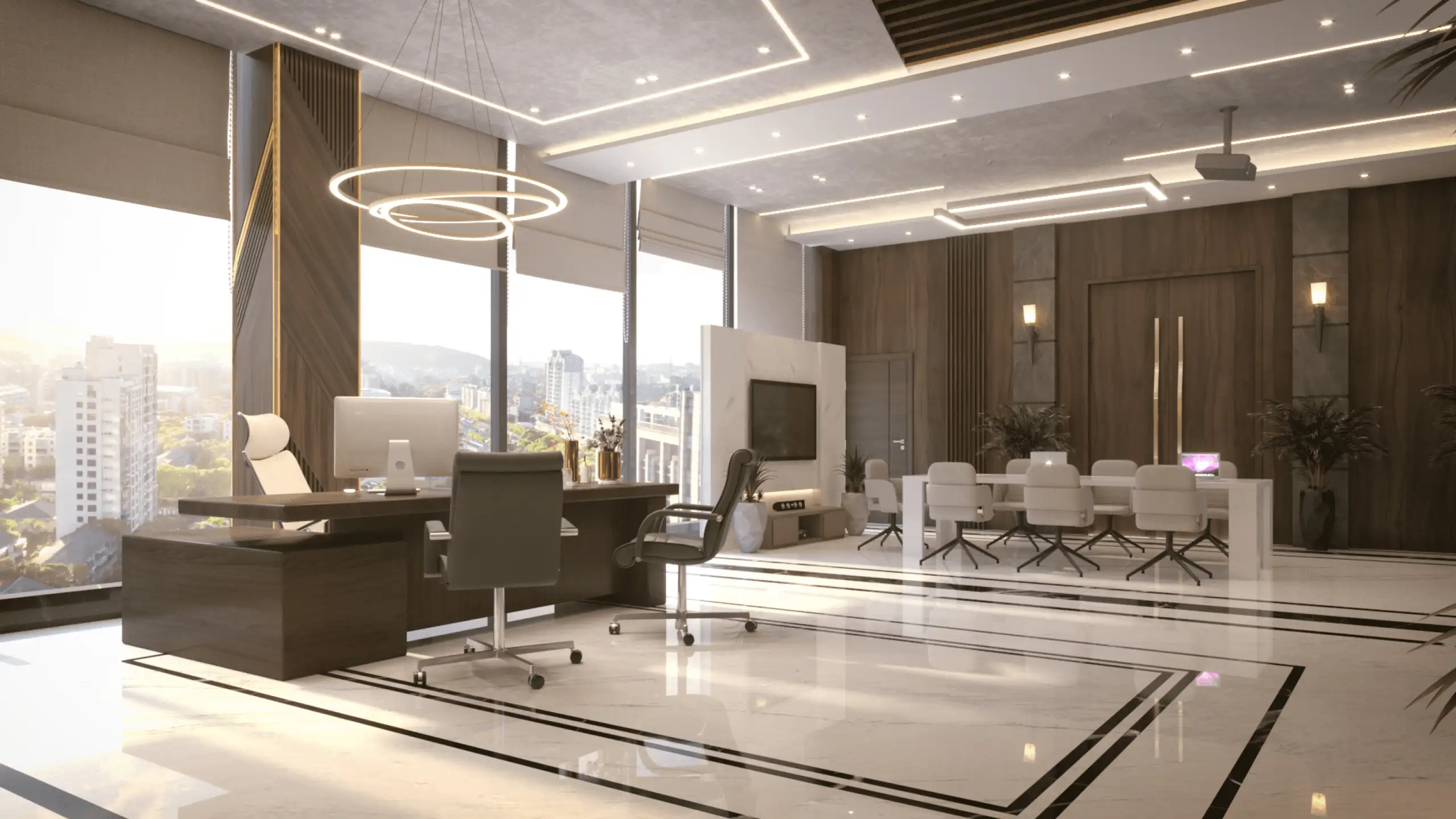 الأرضيات: تتنوع الخيارات بين الرخام الطبيعي للفخامة، البورسلين للمتانة، أو الباركيه لإعطاء لمسة دافئة للمكان.