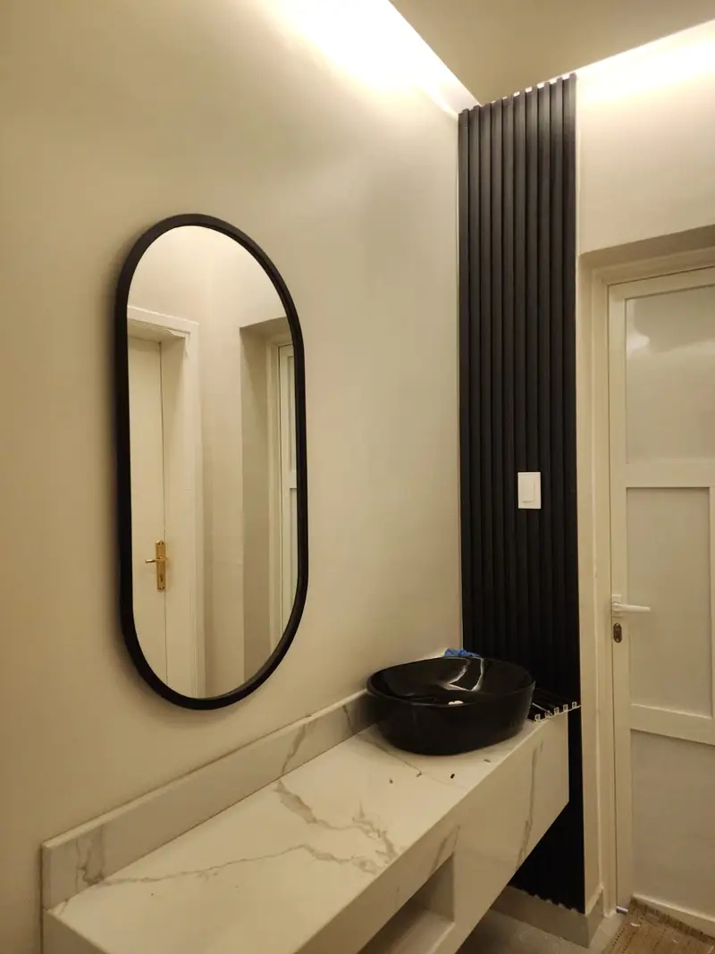 - التكسيات الخشبية والبديلة: دمج دهانات الجدران مع “بديل الرخام” أو “بديل الخشب” لإضافة لمسة فندقية.